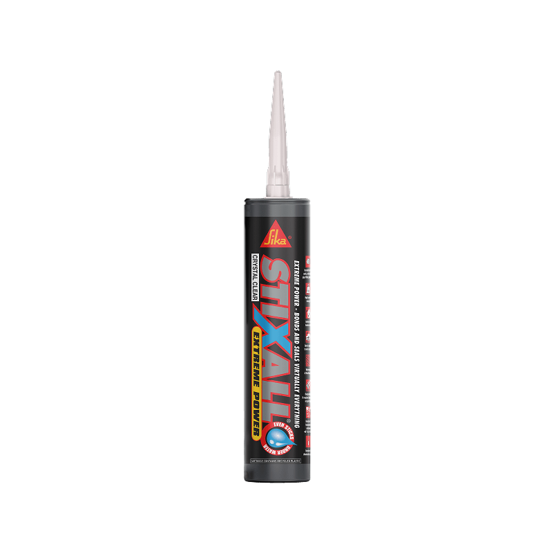 Sika StixAll Extreme Power Crystal Clear is a one-part, moisture-curing adhesive and sealant that combines the best qualities of silicone and polyurethane technologies. It’s considered “extreme power” due to its incredible initial grab, no-slip properties, high bonding strength, and ability to bond and seal virtually anything to anything in nearly all conditions, including wet surfaces.
