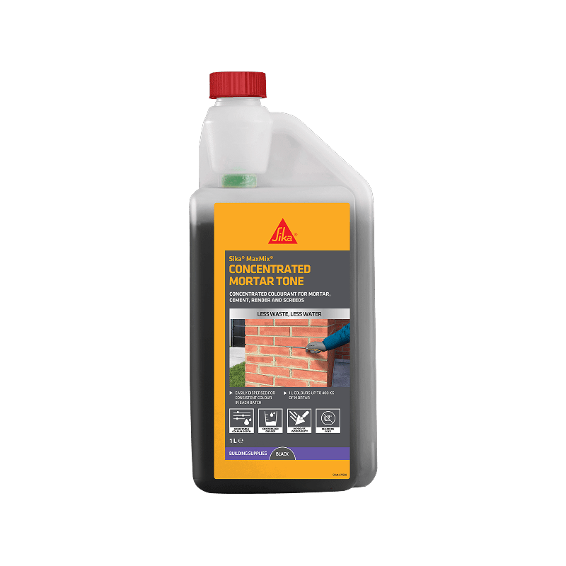 Sika MaxMix Concentrated Mortar Tone recommended dosage is 25 mL per 10 kg of mortar. A 1l bottle will colour up to 400 kg of mortar!