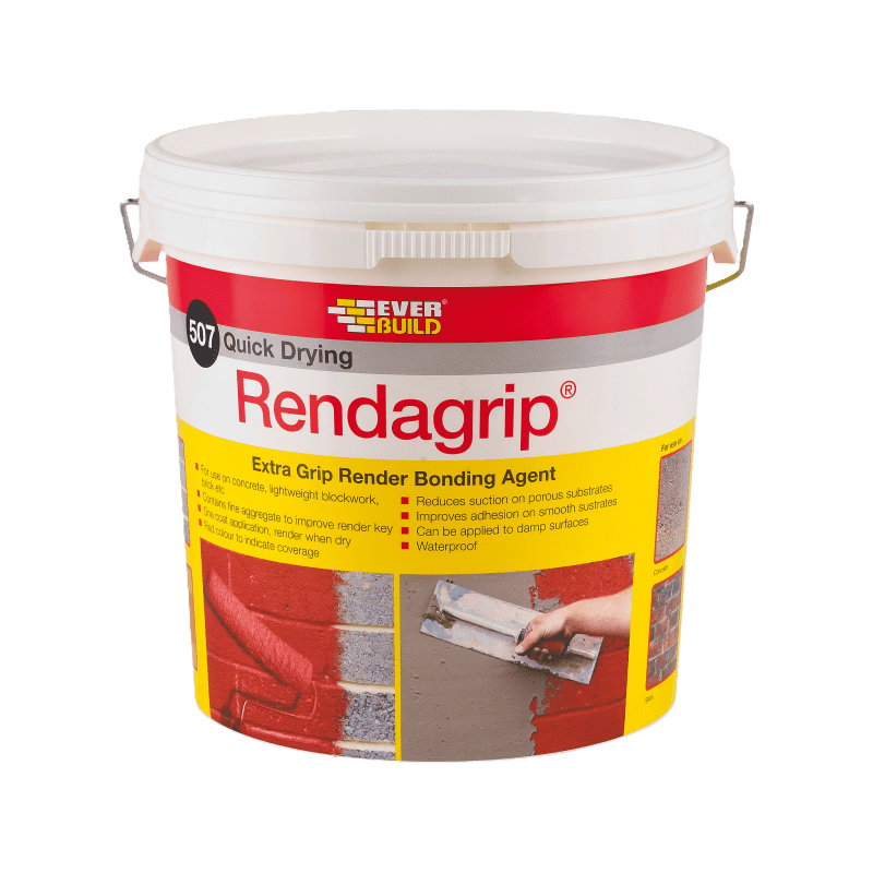 Everbuild 507 Rendagrip is a quick-drying, extra-grip render bonding agent designed to improve key before applying render on external surfaces like concrete, brickwork, and blockwork. It contains fine aggregates suspended in a unique waterproof polymer, which reduces the porosity/suction of the substrate and provides a strong mechanical key, improving overall adhesion.