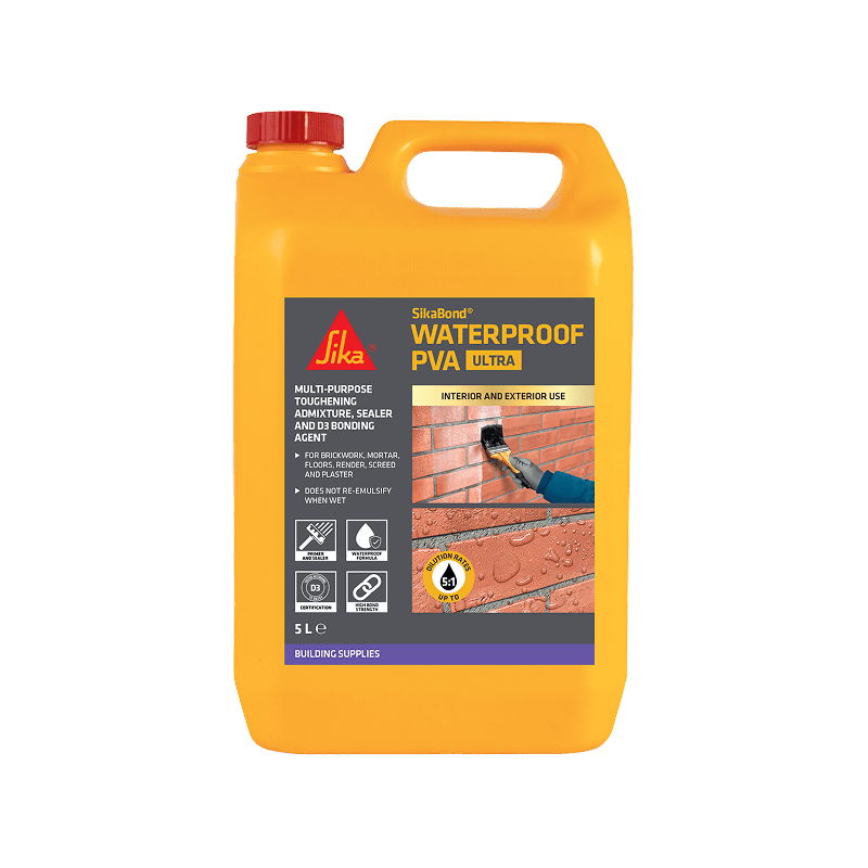 It can be applied by brush, roller, or added directly to cement mixes. Dilution depends on the use – for priming, dilute 1 part SikaBond Waterproof PVA Ultra with 5 parts water; for bonding, use 1 part PVA to 0.5 parts water.