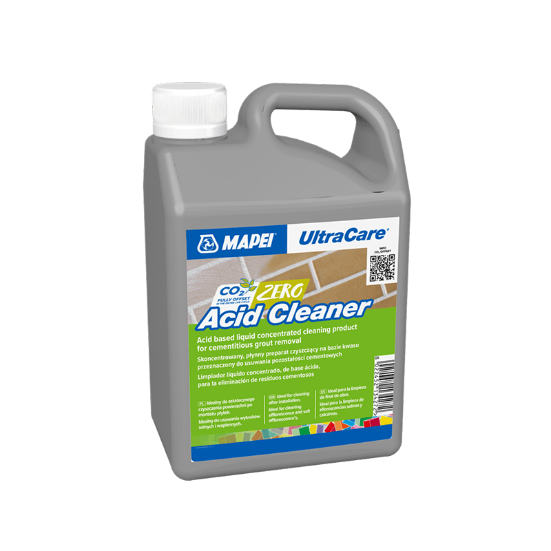 Mapei Ultracare Acid Cleaner is a concentrated acid cleaner with CO2 fully offset in the entire life cycle. Concentrated acid-based cleaner in liquid form to remove stubborn cementitious grout residues from glass mosaic, ceramic and acid resistant natural stone. Ideal for cleaning after installation and to remove salt and limescale efflorescence.