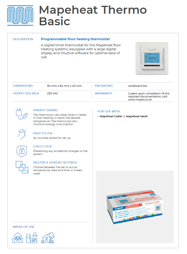Mapei offer 3 thermostats as part of the Mapeheat electric underfloor; Thermo Basic, Thermo Connect and Thermo Touch.