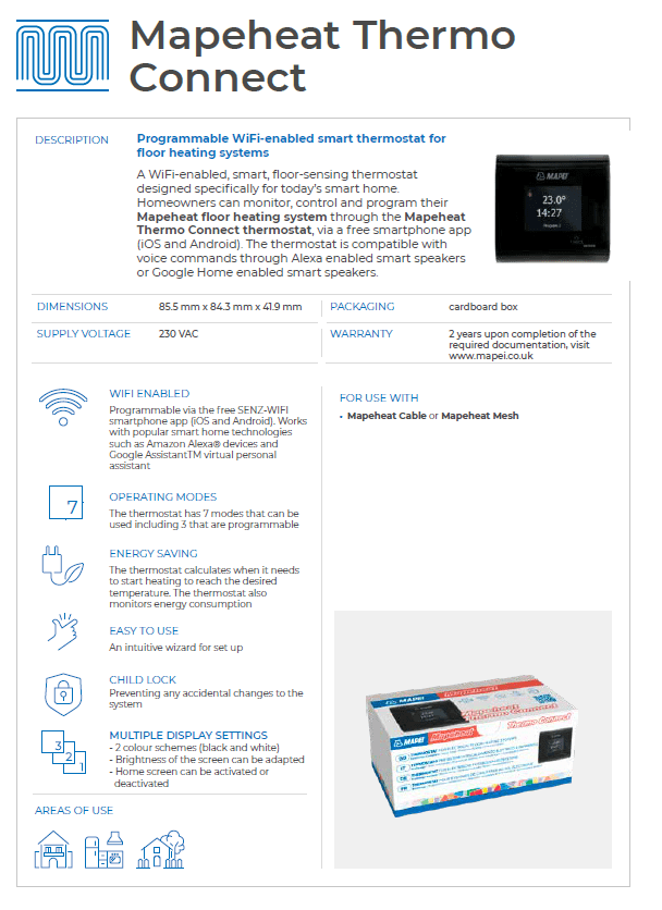 Mapei Mapeheat Thermo Connect is a programmable WiFi-enabled smart thermostat for electric floor heating systems. The Mapeheat Thermo Connect is a smart and easy to use touchscreen thermostat for electrical...